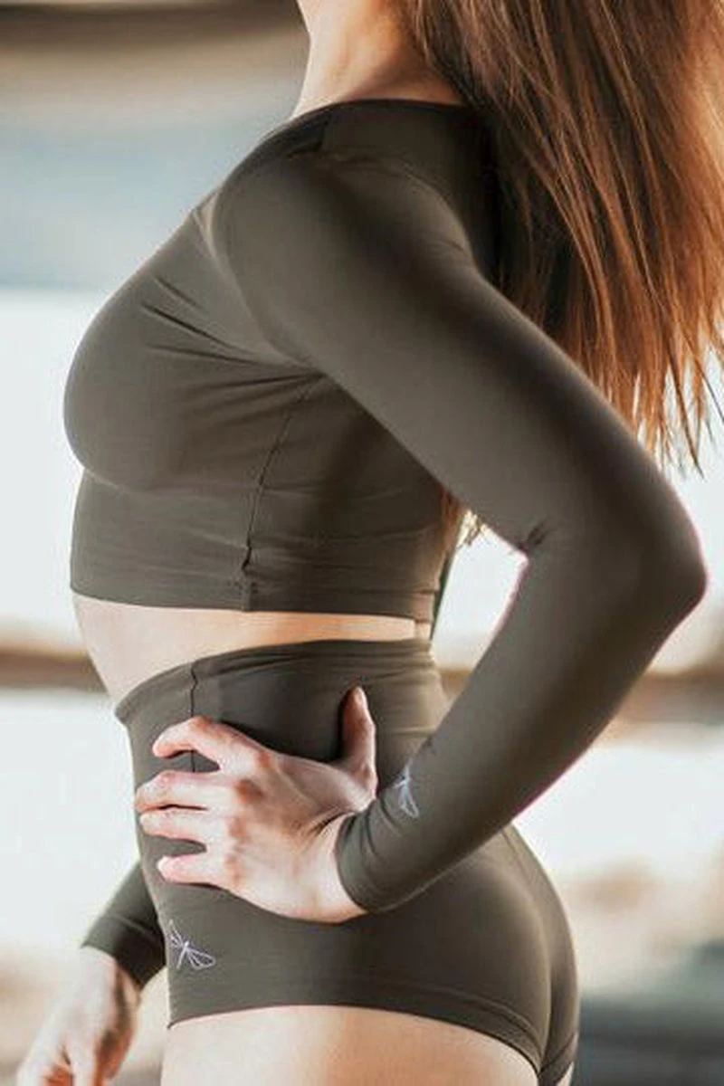The Pavi Crop Top is an instant classic. Made with Dragonfly’s signature peachy soft lycra, we love the versatility of this long sleeved crop top – pair with the Adriana Leggings for stretch class, the Betty Shorts for pole training or your fave jeans for venturing out of the studio.