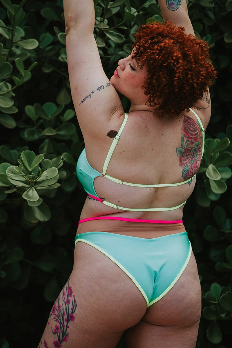 This shimmery neon set is out of this world. These reversible high leg bottoms can be worn Blue or Rosé so you can change up our look. We love the cheeky cut and neon piping details.